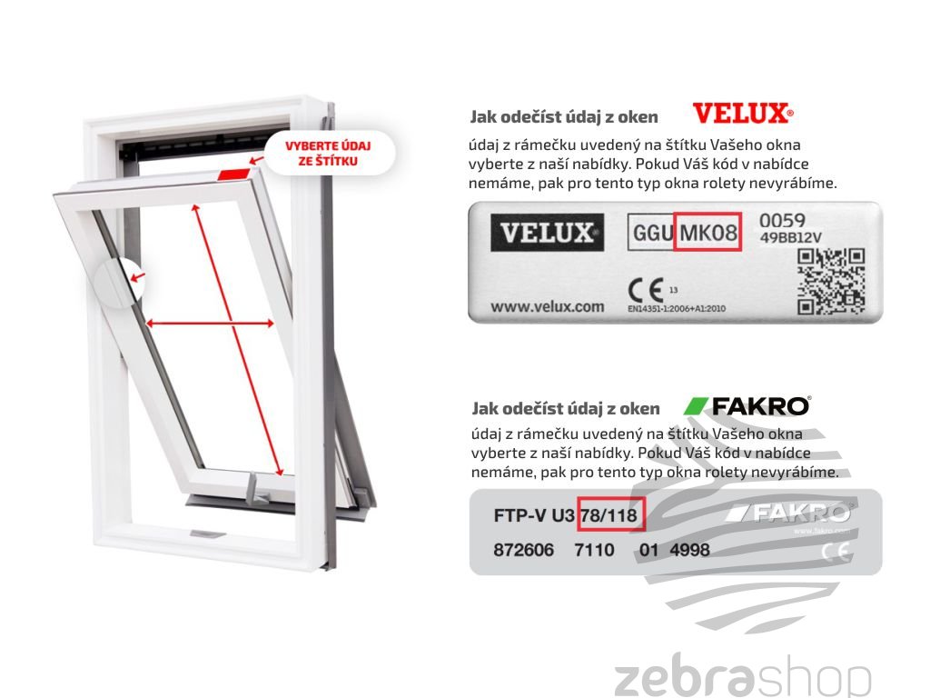 Plisovaná roleta pro střešní okna VELUX nebo FAKRO.  Odstín látky dle obrázku. Vyberte značku okna, typ okna dle štítku a barvu profilů. Profily nabízíme bílé, stříbrné a v dekoru borovice. Charakteristiku látky najdete v podrobném popisu níže. Plissé vyrobíme na míru dle zadaného typu okna.